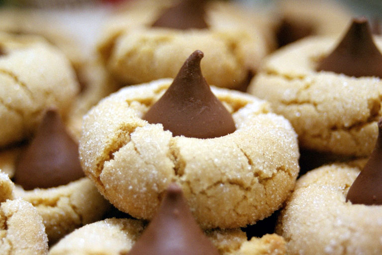 - Remove cookies from oven, and immediately press a unwrapped Hershey's Kiss into the center of each cookie; the